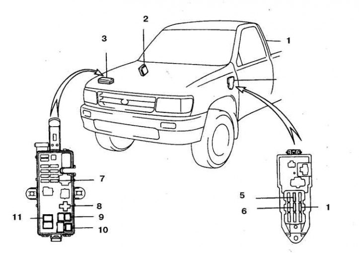 1. Соединительная коробка N 1; 2. Монтажный блок; 3. Процессорный блок; 4. Плавкая вставка STOP на 15 А; 5. Плавкая вставка IGN на 15 А; 6. Плавкая вставка GAUGE на 10 А; 7. Плавкая вставка процессорного блока на 15 А; 8. Главное реле; 9. Плавкая вставка АМ1 на 40 А; 10. Плавкая вставка АМ2 на 30 А; 11. Плавкая вставка ALT FL на 80 А