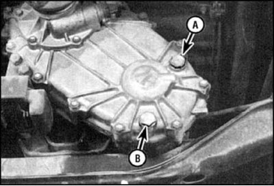 2. Уровень масла должен находиться около нижнего края отверстия (A – контрольное/ заправочное отверстие, В – сливное отверстие в картере раздаточной коробки).