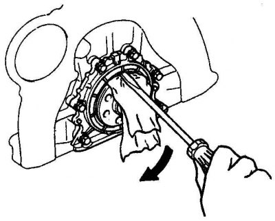 2. Сальник можно снять без демонтажа масляного поддона или снятия держателя сальника. Однако такой способ не рекомендуется, так как сальник установлен в держателе с большим натягом, и поэтому можно повредить сальник или в самом держателе, или при установке. Если вы тем не менее хотите попробовать, то отверткой извлеките старый сальник.