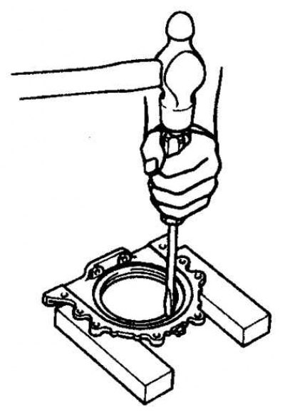 6. Поставив держатель с сальником на два деревянных бруска, выбейте сальник отверткой с обратной стороны.