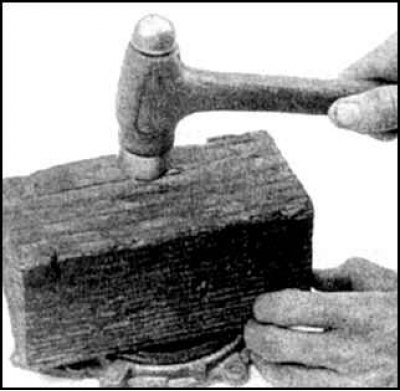 7. Запрессуйте в держатель новый сальник ударами молотка через деревянную проставку.