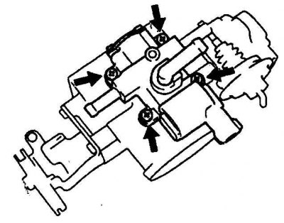 1. Отверните винты (указаны стрелками) и снимите регулятор и прокладку. При необходимости снимите корпус заслонки.
