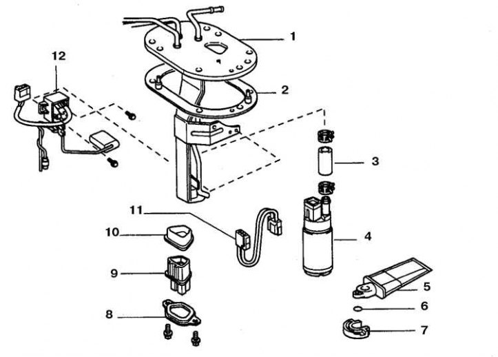 1. Кронштейн; 2. Прокладка; 3. Шланг; 4. Насос; 5. Фильтр; 6. Пружинное кольцо; 7. Подушка; 8. Фланец разъема; 9. Разъем; 10. Прокладка; 11. Провод; 12. Указатель уровня топлива