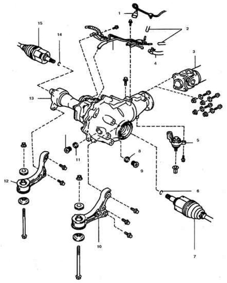 1. Разъем переключателя привода; 2. Вакуумные шланги; 3. Передний карданный вал; 4. Шланг сапуна; 5. Задняя опора; 6, 14. Стопорное кольцо; 7. Левая полуось; 8, 11. Прокладка; 9. Сливная пробка; 10. Левая передняя опора; 12. Правая передняя опора; 13. Редуктор; 15. Правая полуось