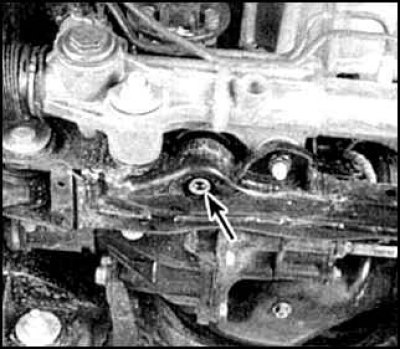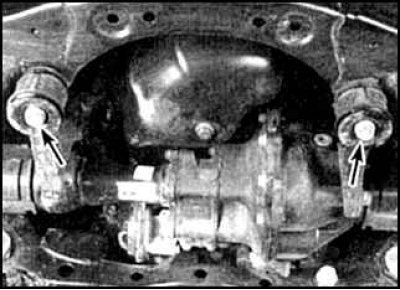 8. Отверните гайку задней опоры (фото слева) и гайки двух передних опор (фото справа). Опустите редуктор.
