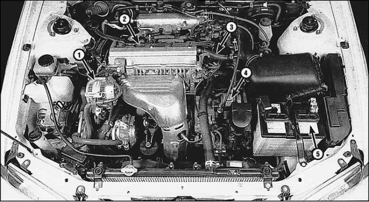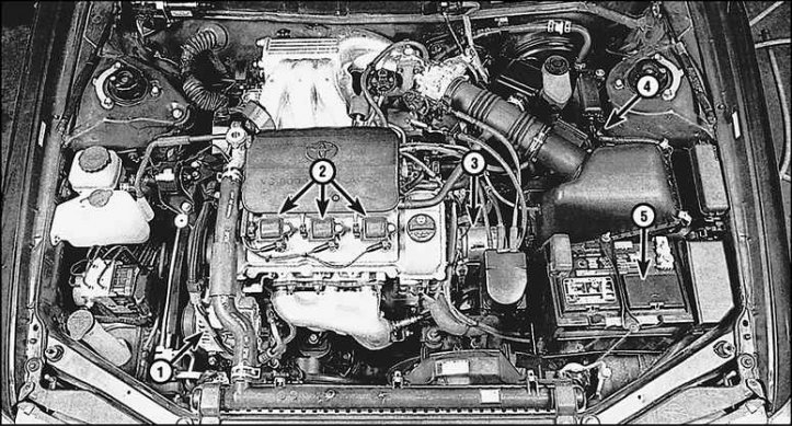 1. Генератор; 2. Высоковольтные провода; 3. Модуль катушки и блока зажигания; 4. Стартер; 5. Батарея