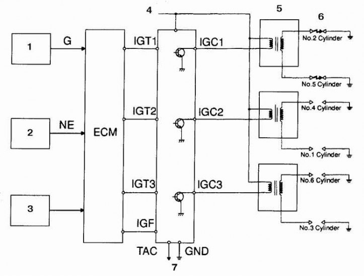 1. Датчик вращения распредвала; 2. Датчик вращения коленвала; 3. Остальные датчики; 4. От батареи; 5. Катушка зажигания; 6. Свеча