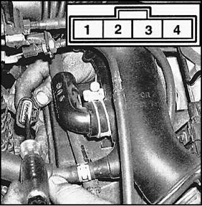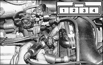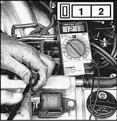 Для проверки напряжения на катушке на 4-цилиндровом двигателе отсоедините разъем, включите зажигание и присоедините вольтметр к выводу 1 разъема (проверка выполняется на неработающем двигателе).