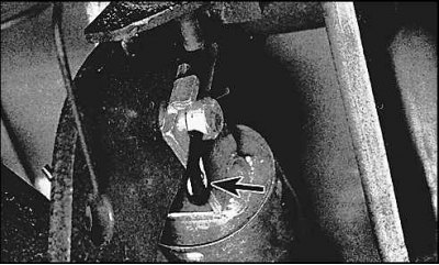 2. Расшплинтуйте и отсоедините толкатель главного цилиндра от педали сцепления (стрелкой указан шплинт вилки толкателя цилиндра сцепления). Отсоедините от цилиндра магистраль гидропривода, слейте жидкость и заглушите трубки.