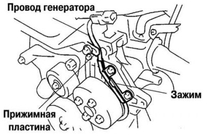 Затяните болты крепления зажима жгута проводов и болт крепления провода генератора.
