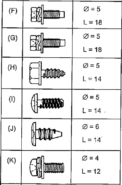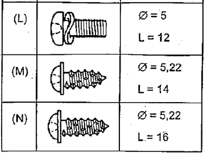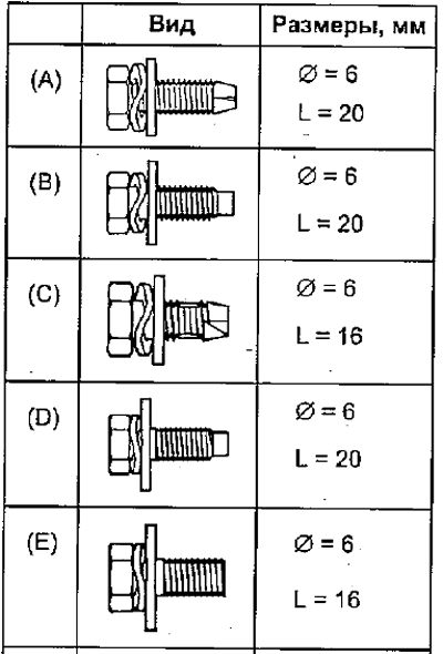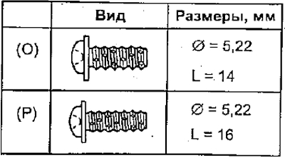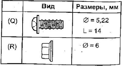 В таблице указанны условные обозначения, виды и размеры крепежных элементов панели приборов.