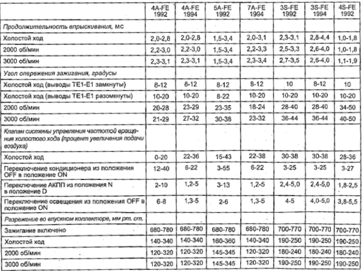 Тойота Карина Т190 (1992-1996): Некоторые технические данные системы электронного управления