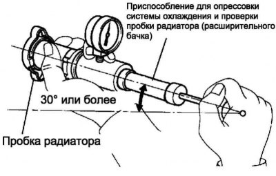Примечание. При выполнении перывых двух операций приспособление для опрессовки системы следует держать под углом к горизонтали 30° или более.