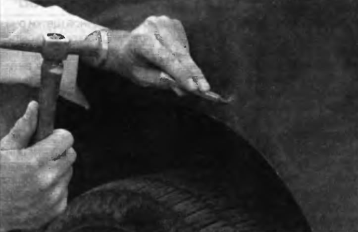 2 ...затем вверните вышеназванное приспособление в отверстие и выверните правку вмятины. Постукивайте молотком у края вмятины, чтобы помочь металлу принять первоначальную форму. После включения этой процедуры форма ремонтируемой зоны должна приблизиться к своему исходному очертанию и поверхность вмятины должна быть примерно на 3 мм ниже поверхности окружающего металла