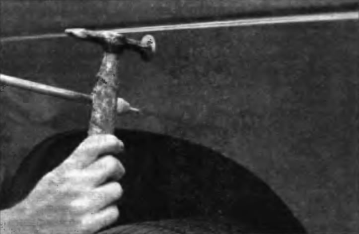 1. Если не удается подобраться к тыльной стороне панели для правки вмятины с помощью молотка, выправьте вмятину с помощью приспособления для вытягивания вмятин, похожих на молоток с подвижным бойком. Просверлите или пробейте отверстие в самой глубокой точке вмятины или несколько отверстий вдоль вмятины ив расстоянии паи минимум 25 мм друг от друга...