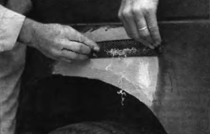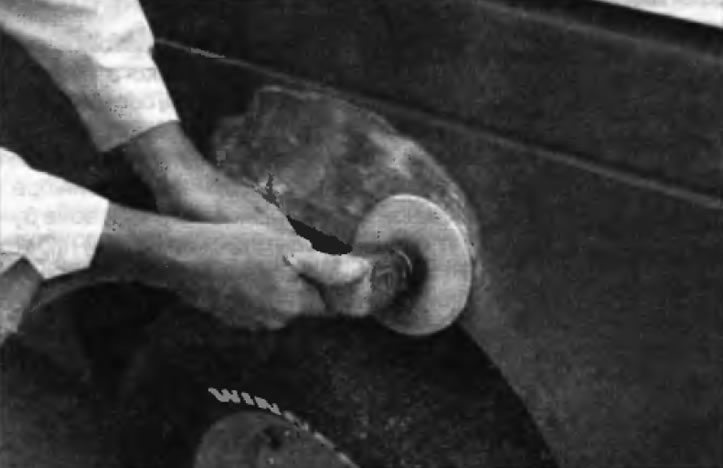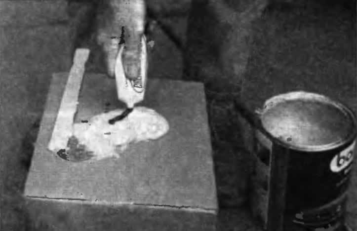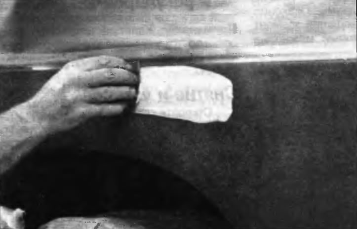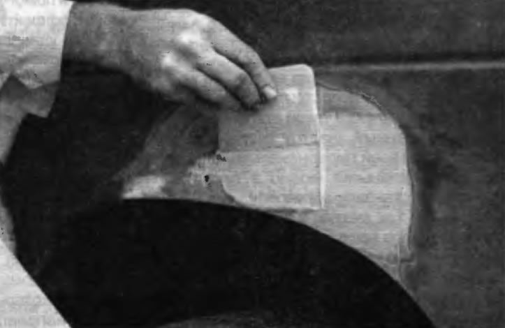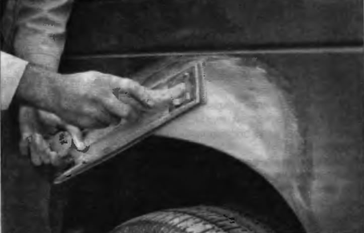 32. После того как шпатлевка отвердеет, излишек можно удалить с помощью металлического скребка или напильника. Затем обработайте поверхность наждачной бумагой, постепенно переходя от грубой бумаги к более тонкой. Начните с бумаги с зернистостью 180 и закончите чистовой обработкой водостойкой бумагой с зернистостью 600. Наждачную бумагу следует обернуть вокруг плоского резинового, пробкового или деревянного бруске. В противном случае зашпатлеванная поверхность не будет идеально ровной. При выравнивании поверхности шпатлевки водостойкой нежданной бумагой последнюю следует периодически смачивать водой. Это позволит обеспечить гладкую поверхность на заключительной стадии.