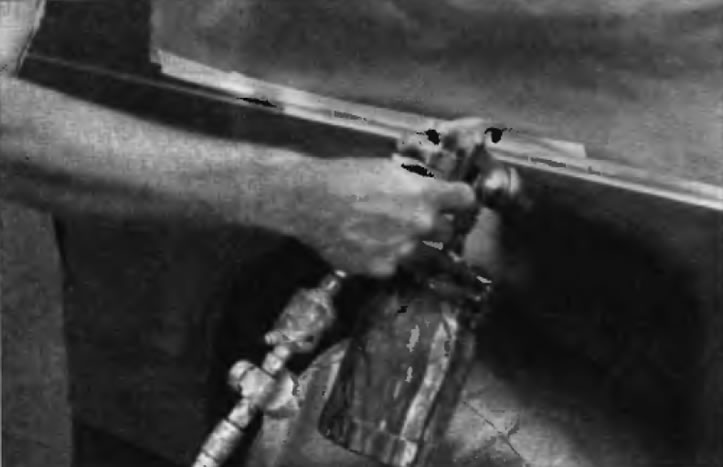 36. Перед началом распыления тщательно взболтайте аэрозольный баллончик и опробуйте струю на контрольной поверхности (подойдет старый кусок жести или что-то аналогичное). Отработайте технологию распыления. Нанесите на зону ремонта толстый слой грунта. Требуемой толщины лучше добиться нанесением нескольких тонких слоев, а не одного толстого. Отшлифуйте загрунтованную поверхность водостойкой наждачной бумагой с зернистостью 600, периодически смачивая ее водой, до получения гладкой поверхности. При выполнении этого зону ремонта следует полностью смачивать водой и также периодически смачивать в воде бумагу. Давайте поверхности возможность высыхать перед нанесением следующего слоя.