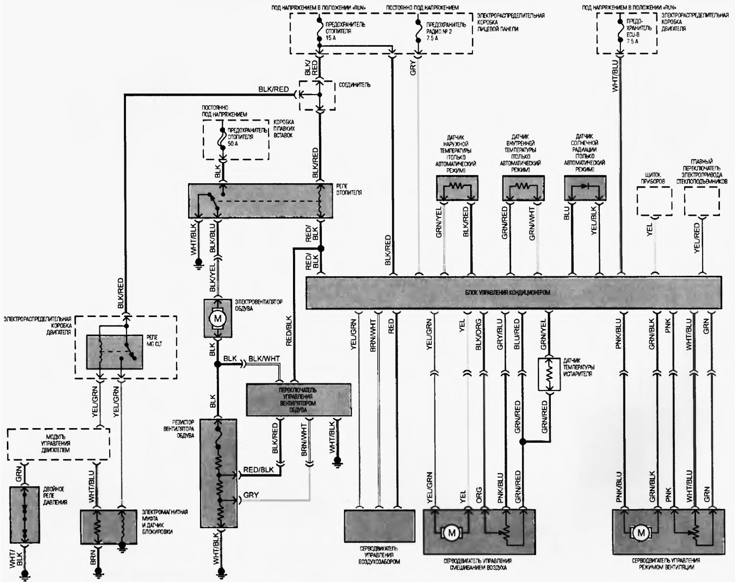 Статья о ремонте японских автомобилей Тойота Хайлендер 1 (2000-2007, бензин): Схема 1. Система кондиционирования воздуха: https://www.toyotaman.ru/Highlander/XU20/electrics/schemes/shema-1-sistema-kondicionirovaniya-vozduha