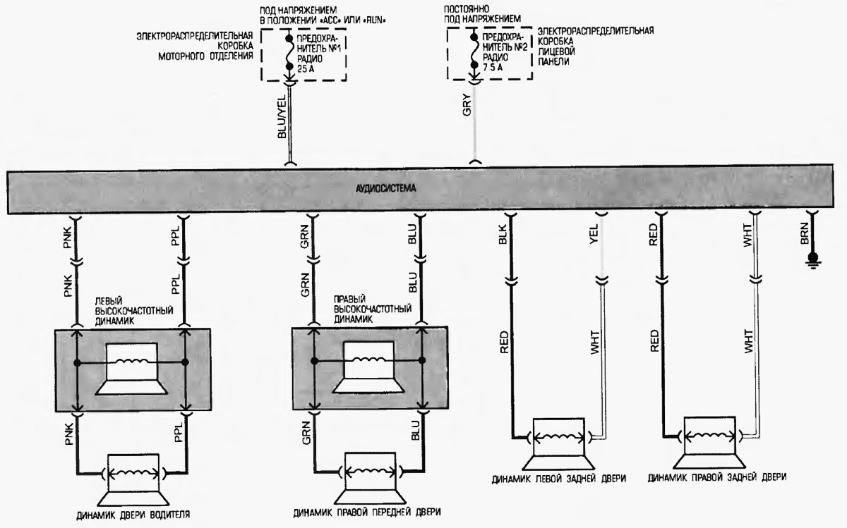 Статья о ремонте японских автомобилей Тойота Хайлендер 1 (2000-2007, бензин): Схема 18. Базовая аудиосистема: https://www.toyotaman.ru/Highlander/XU20/electrics/schemes/shema-18-bazovaya-audiosistema