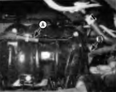 Рис. 8.4. Отметьте ярлычками вакуумный шланг (и) (А) и отсоедините его (их) от впускного коллектора, снимите фиксатор(ы) жгута электропроводки (В)