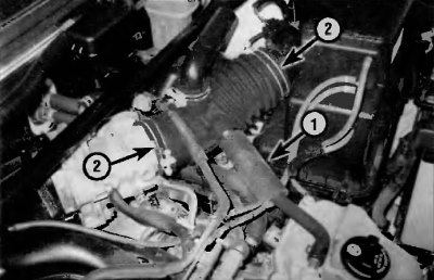 Рис. 9.2. Для снятия впускного воздухопровода отсоедините впускной шланг свежего воздуха системы PCV (1) и опустите хомуты (2) и в обоих концах воздухопровода, а затем отсоедините воздухопровод от корпуса воздушного фильтра и корпуса дроссельной заслонки (показав модель с двигателем V6)