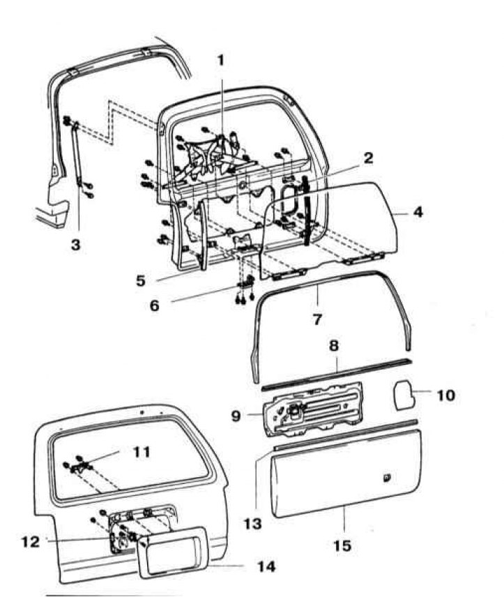 1 - Регулятор стеклоподъемника; 2 - Правая направляющая стеклоподъемника; 3 - Упор двери; 4 - Заднее стекло; 5 - Левая направляющая стеклоподъемника; 6 - Замок двери; 7 - Направляющая лента облицовки оконного проема; 8 - Наружная уплотнительная лента; 9 - Крышка сервисного отверстия; 10 - Пластина; 11 - Коленчатый рычаг привода защелки; 12 - Цилиндр замка; 13 - Внутренняя уплотнительная лента; 14 - Облицовочная панель номерного знака; 15 - Панель обивки двери задка