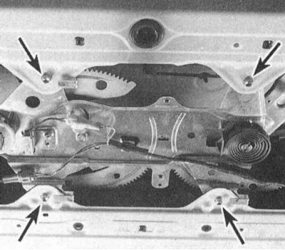 4. Отпустите десять фиксаторов крепления панели внутренней обивки двери. Отсоедините электропроводку и выверните винты крепления крышки сервисного отверстия (обратитесь к иллюстрации выше).