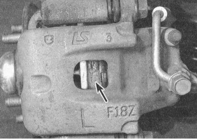 1. Суппорт каждого из тормозных механизмов оборудован двумя колодками, внутренней и наружной. Торцы колодок хорошо просматриваются через специальное смотровое окно в корпусе суппорта (обратитесь к сопроводительным иллюстрациям) после снятия колеса.