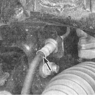 6. Перед тем как устанавливать на место колеса, осмотрите все тормозные линии на наличие признаков повреждений, износа, разрушения в результате старения материала, следов утечек, изгибов, скручиваний и прочих деформаций (в особенности вблизи точек подсоединения гибких тормозных шлангов к суппортам тормозных механизмов) (обратитесь к сопроводительной иллюстрации). Проверьте надежность крепления шлангов хомутами. Удостоверьтесь, что никакие из тормозных шлангов не соприкасаются с острыми углами расположенных по соседству компонентов кузова, системы выпуска отработавших газов или подвески (при любых положениях рулевого колеса). В случае необходимости произведите соответствующий ремонт или подкорректируйте маршрут прокладки линий. Дефектные компоненты замените (см. Главу Тормозная система).