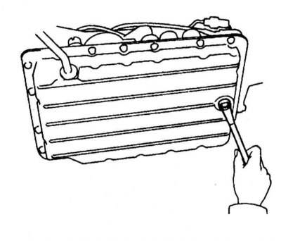 4. Заведите под поддон сливную емкость и весь необходимый инвентарь. Старайтесь не прикасаться к расположенным под днищем автомобиля разогретым компонентам силового агрегата и системы выпуска отработавших газов. Разместив должным образом приемную тару, выверните сливную пробку (обратитесь к сопроводительной иллюстрации). Когда вытекание жидкости полностью прекратится, протрите сливную пробку, вверните ее на свое штатное место и прочно затяните.