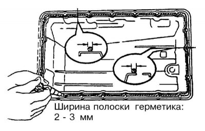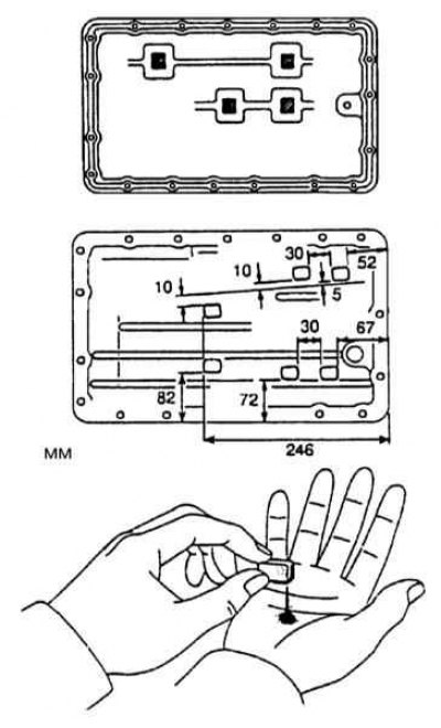 11. Удостоверьтесь в абсолютности чистоты и сухости сопрягаемой поверхности поддона и наложите на нее подушку герметика Three Bond 1281 или подобного (обратитесь к сопроводительной иллюстрации). Наденьте патрубок заливной горловины на направляющую трубку измерительного щупа и прижмите поддон к картеру трансмиссии. Двигаясь по периметру поддона, в несколько приемов затяните крепежные болты с требуемым усилием.