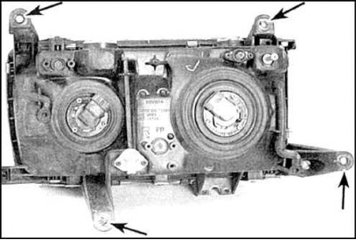 Отверните болты и снимите фару (метки крепления галогенной фары указаны стрелками).
