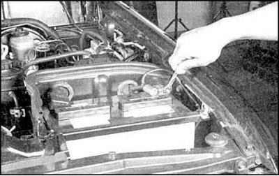 1. Отсоедините от батареи оба кабеля, начав с кабеля отрицательного полюса, затем отсоедините клемму положительного полюса, отвернув гайки и снимите крепежный бандаж батареи.