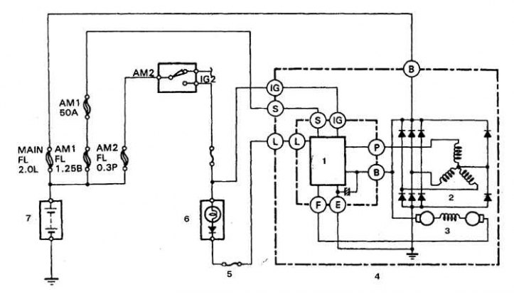 1. Регулятор напряжения; 2. Статор; 3. Ротор; 4. Генератор; 5. Предохранитель 7,5 А; 6. Контрольная лампа; 7. Батарея