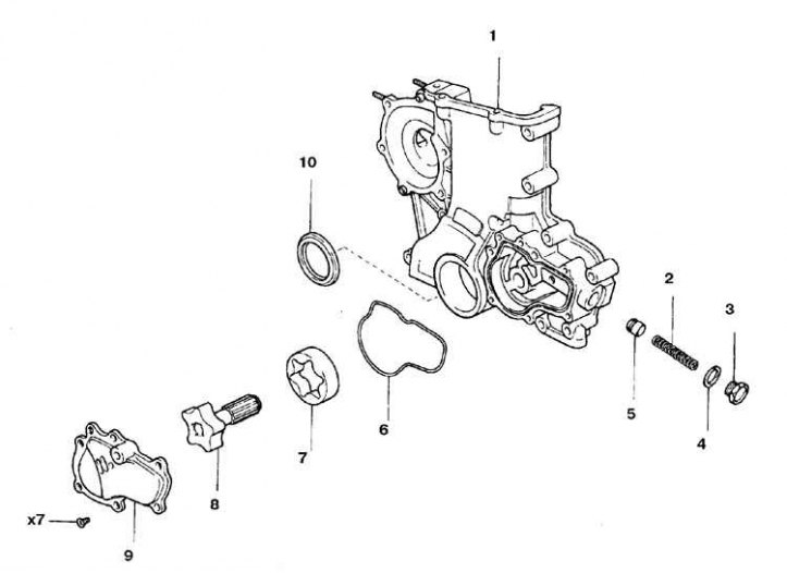 1. Насос (передняя крышка); 2. Пружина; 3. Заглушка; 4. Прокладка; 5. Редукционный клапан; 6. Прокладка; 7. Ведомый ротор; 8. Ведущий ротор; 9. Крышка насоса; 10. Сальник коленвала