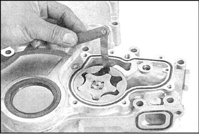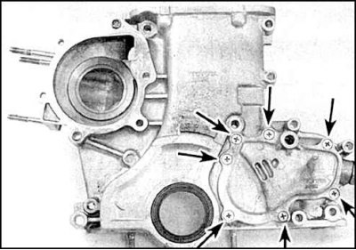 4. Отверните 7 винтов (указаны стрелками) и снимите корпус масляного насоса.