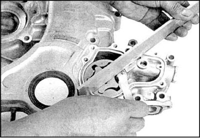 6. Установите крышку цепи, введя ведущий ротор масляного насоса в зацепление с ведущей шестерней коленвала.