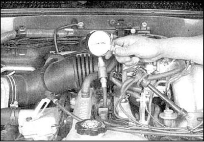 5. Включите стартер и следите за показаниями манометра. На исправном двигателе давление должно нарастать быстро. Низкое давление после первого хода поршня и медленное нарастание при последующих тактах сжатия указывает на износ поршневых колец. Если после первого хода поршня давление низкое, и при последующих тактах сжатия не возрастает, то причиной является утечка в клапанах или негерметичность прокладки или головки цилиндров. Запишите наибольшее значение компрессии.