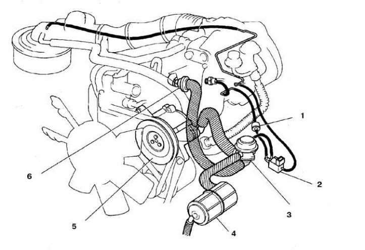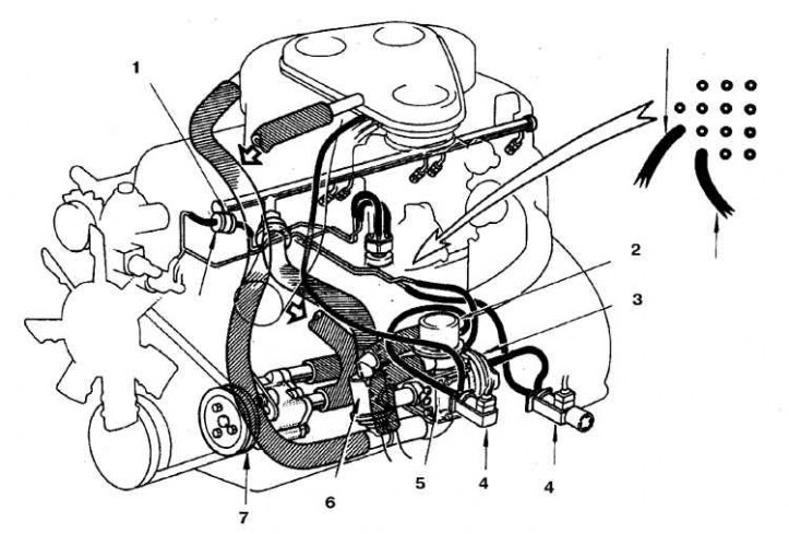 1. Термовакуумный распределитель; 2. Перепускной воздушный клапан (ABV-клапан); 3. Пневмопереключатель; 4. Вакуумный распределитель; 5. Контрольный воздушный клапан; 6. Редукционный клапан; 7. Воздушный насос
