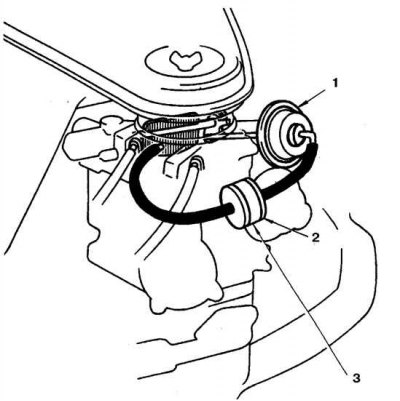 1. Диафрагма управления воздушной заслонкой; 2. Зеленая окраска; 3. Демпфирующий вакуумный клапан