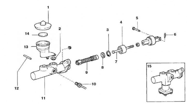 1. Пробка бачка; 2. Уплотнитель; 3. Пружинное кольцо; 4. Чехол; 5. Штифт; 6. Шплинт; 7. Толкатель; 8. Чашка; 9. Поршень; 10. Штуцер магистрали; 11. Цилиндр; 12. Штифт крепления бачка; 13. Бачок; 14. Поплавок; 15. Цилиндр в сборе