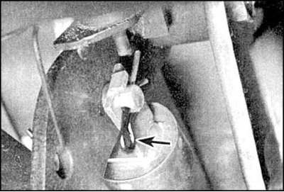 2. Отсоедините толкатель главного цилиндра от педали сцепления. Для снятия цилиндра сцепления расшплинтуйте и лостаньте ось (указана стрелкой).