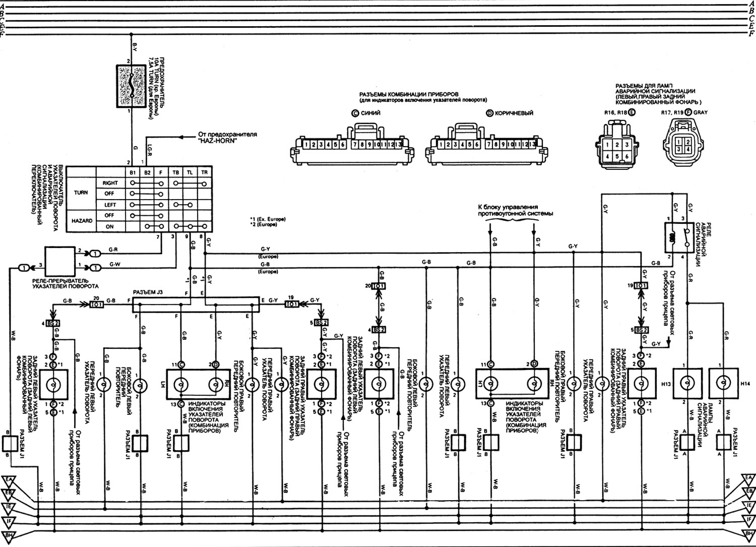 Статья о ремонте японских автомобилей Тойота Крузер 70 (1985-1996, дизель): Схема 9: указатели поворота и аварийная сигнализация: https://www.toyotaman.ru/Land_Cruiser/J70_d/electrics/schemes/shema-9-ukazateli-povorota-i-avariynaya-signalizaciya