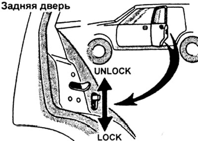 Данная функция позволяет запереть дверь так, что она может быть открыта только снаружи. Рекомендуется использовать эту функцию каждый раз, когда в автомобиле находятся маленькие дети. Для включения переместите запорный рычаг в положение "LOCK", как показано на рисунке.