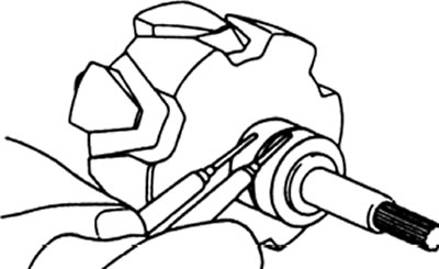 б) Снимите распорное кольцо и пружинное стопорное кольцо с вала ротора.