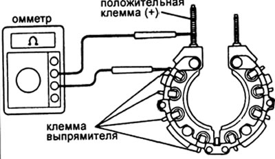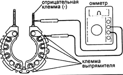 а) Подсоедините отрицательный пробник (щуп) омметра к положительному выводу выпрямительного блока, а положительный пробник (щуп) последовательно подсоединять к каждому из трех остальных выводов.