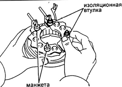 а) Поместите две изоляционных втулки на положительные шпильки (+) выпрямительного блока.