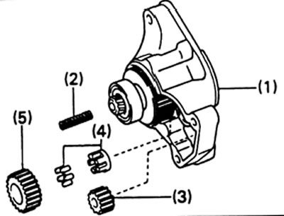 - (1) корпус стартера и узел муфты,