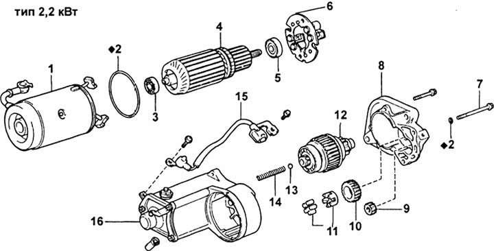Стартер (двигатель 1KZ-T): 1 - обмотка возбуждения, 2 - уплотнительное кольцо, 3 - передний подшипник, 4 - якорь, 5 - задний подшипник, 6 - щеткодержатель, 7 - стяжной болт, 8 - корпус стартера, 9 - ведущая шестерня, 10 - "паразитная" шестерня, 11 - подшипник, 12 - муфта в сборе, 13 - шарик, 14 - возвратная пружина, 15 - провод, 16 - тяговое реле.