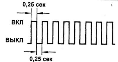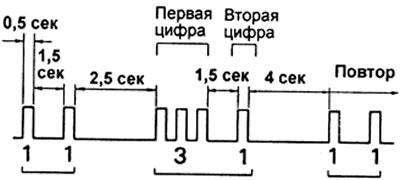 - Код неисправности состоит из двух цифр, первая цифра определяется по первоначальной серии вспышек, затем после паузы в 1,5 секунды, следует вторая серия вспышек, которая соответствует второй цифре кода.